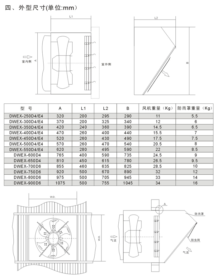 DWEX(WEX)邊墻風(fēng)機(jī)一般用于邊墻壁式排風(fēng),配設(shè)45°防雨罩(或特殊制造成60°)和防蟲網(wǎng)(夜間可防止昆蟲循燈光飛入車間)?砂葱枰瞥蛇厜λ惋L(fēng)機(jī)型號為DWSP(WSP),配設(shè)90°防雨罩(防風(fēng)、雨、塵)和防蟲網(wǎng)(夜間可防止昆蟲循燈光飛入車間)。