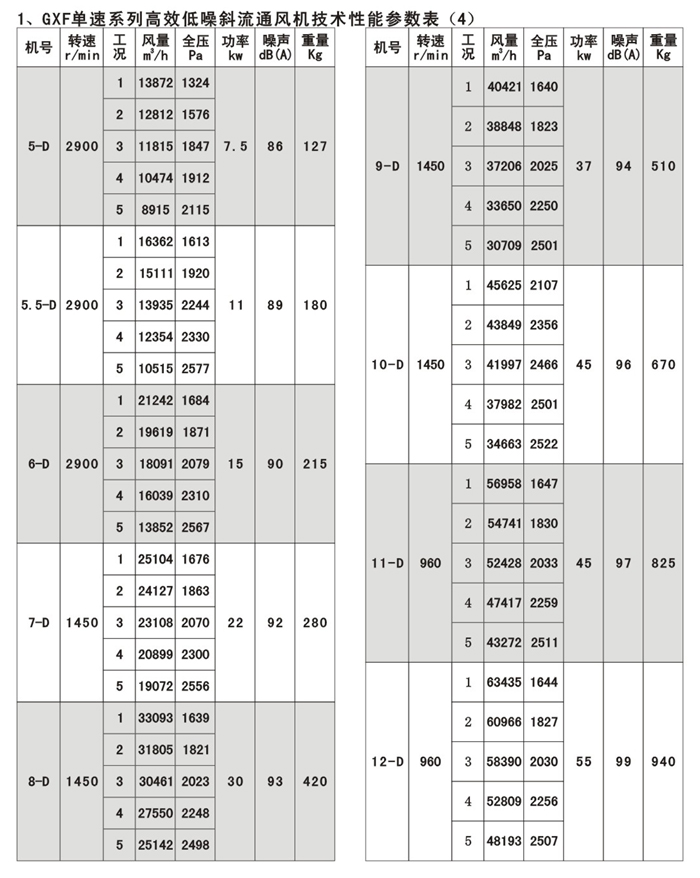 GXF系列斜流通風(fēng)機(jī)按葉輪直徑分為400-1400mm十四規(guī)格,按類型分為A、B、C、D、S五種類型,共五十八個(gè)機(jī)號(hào)。風(fēng)量由3000-90000m3/h,全壓由185-2500Pa;這樣就給設(shè)計(jì)部門和用戶單位提供了充分的選擇條件,具體數(shù)據(jù)請(qǐng)查風(fēng)機(jī)性能參數(shù)表。