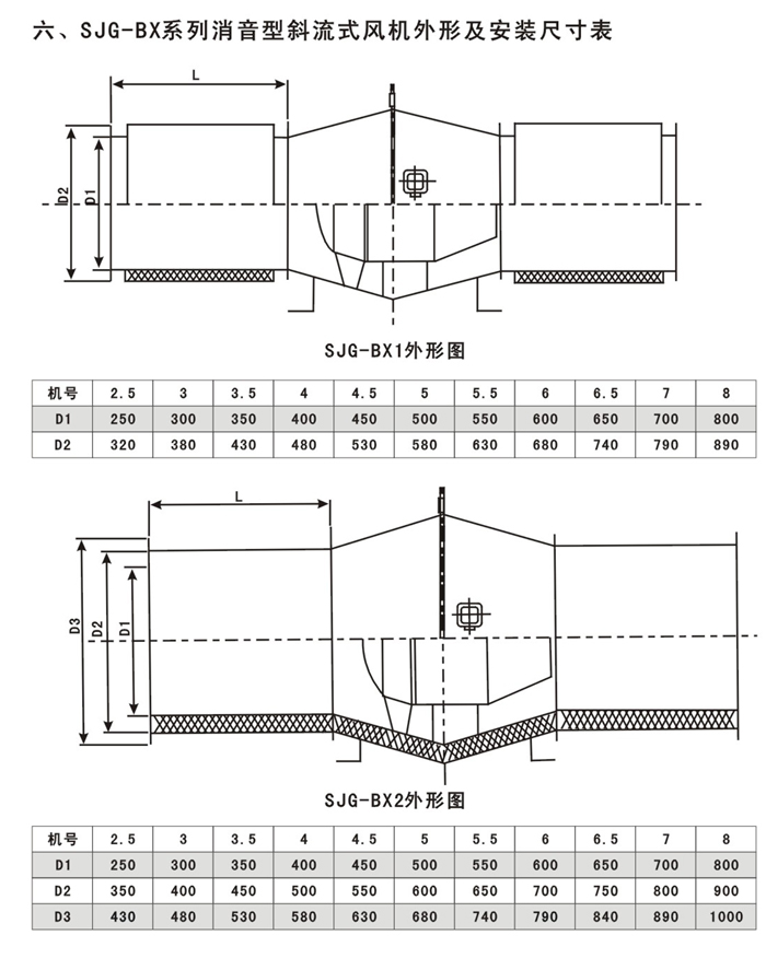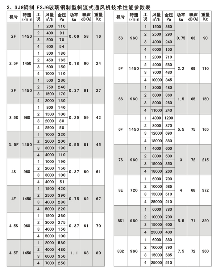 SJG系列斜流式通風(fēng)機(jī)按葉輪直徑分為200-800mm十幾種規(guī)格、十幾個(gè)機(jī)號(hào),風(fēng)量由200-2500m3/h,全壓由50-1200Pa;具體數(shù)據(jù)請(qǐng)查風(fēng)機(jī)性能參數(shù)表。 |