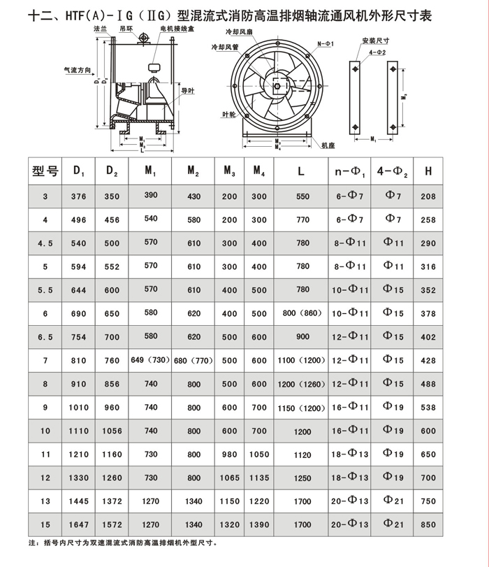 1. HTF(A)系列消防高溫排煙軸流通風機,其基本形式為軸流式結構,采用耐高溫電機,配有專門的電機冷卻系統(tǒng)。具有性能優(yōu)良、耐高溫性能良好、效率高、占地比離心風機少、安裝方便等特點。