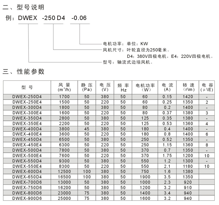 DWEX(WEX)邊墻風(fēng)機(jī)一般用于邊墻壁式排風(fēng),配設(shè)45°防雨罩(或特殊制造成60°)和防蟲網(wǎng)(夜間可防止昆蟲循燈光飛入車間)?砂葱枰瞥蛇厜λ惋L(fēng)機(jī)型號為DWSP(WSP),配設(shè)90°防雨罩(防風(fēng)、雨、塵)和防蟲網(wǎng)(夜間可防止昆蟲循燈光飛入車間)。