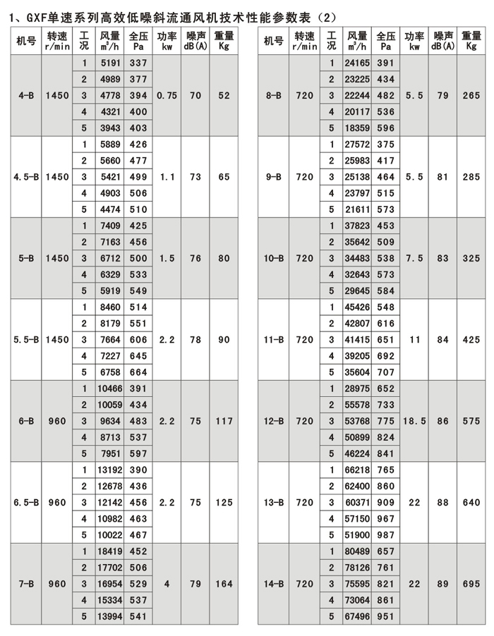 GXF系列斜流通風(fēng)機(jī)按葉輪直徑分為400-1400mm十四規(guī)格,按類型分為A、B、C、D、S五種類型,共五十八個(gè)機(jī)號(hào)。風(fēng)量由3000-90000m3/h,全壓由185-2500Pa;這樣就給設(shè)計(jì)部門和用戶單位提供了充分的選擇條件,具體數(shù)據(jù)請(qǐng)查風(fēng)機(jī)性能參數(shù)表。